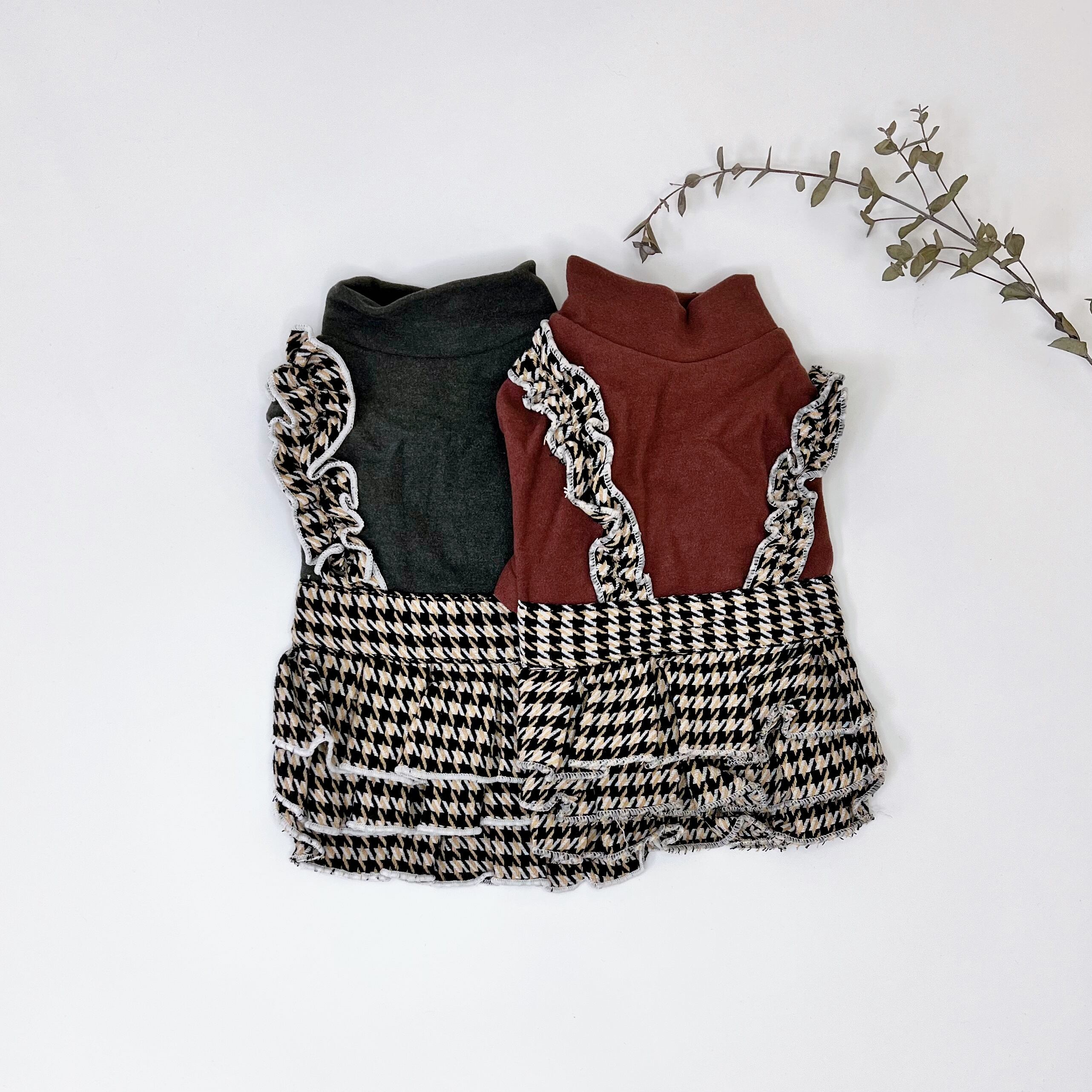 柔らかく肌寒くなった秋に丁度良いトップスに、可愛い千鳥柄のスカートを重ね着風のワンピです♡